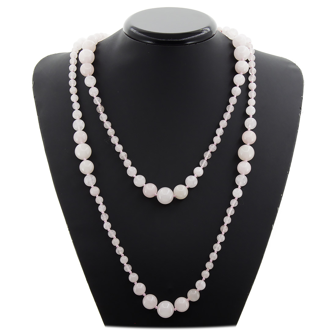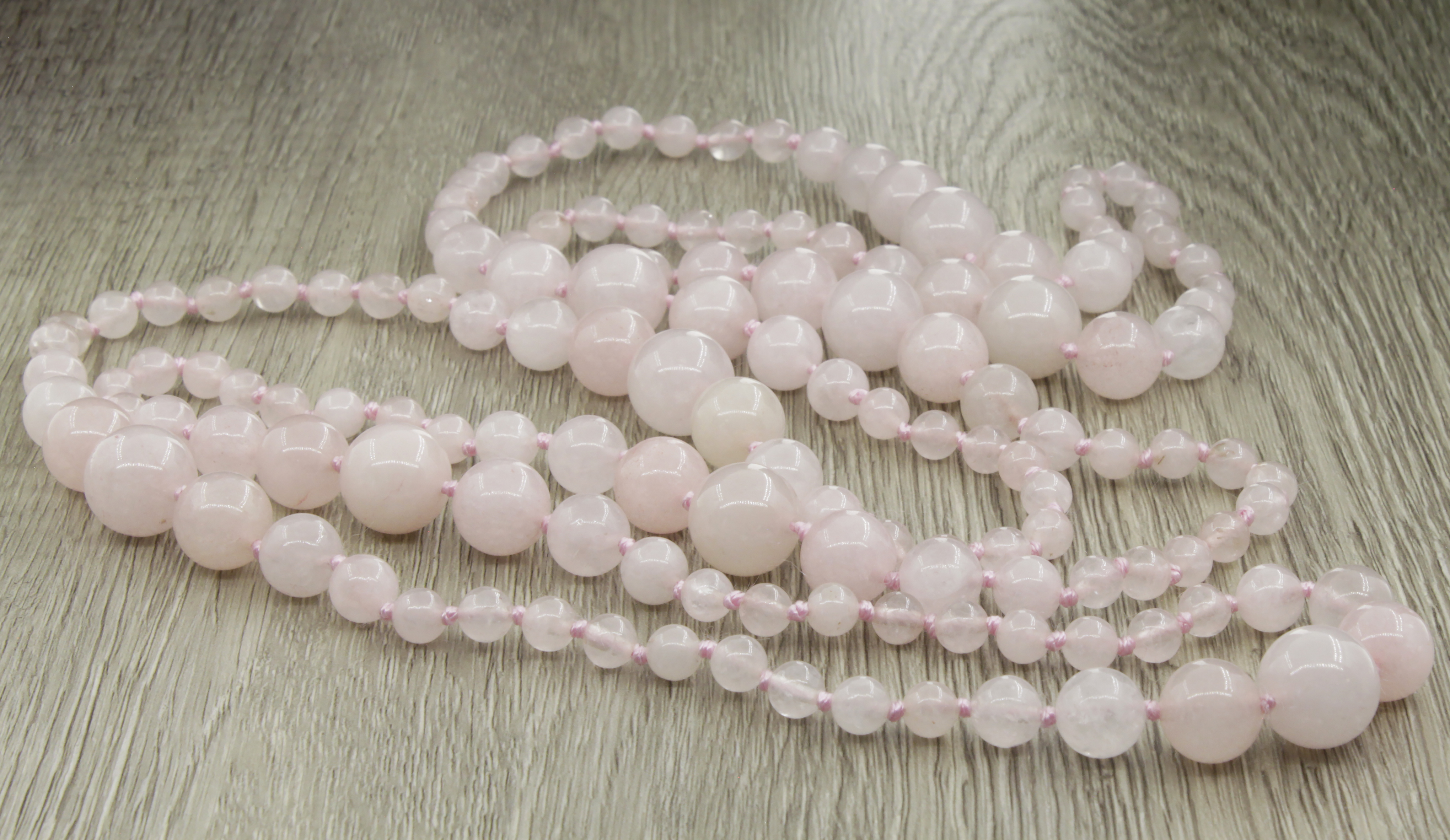 Нежные и гармоничные бусы из натурального розового кварца длиной 150см. В этих бусах удачно подобраны бусинки разных размеров от 6 до 14мм.