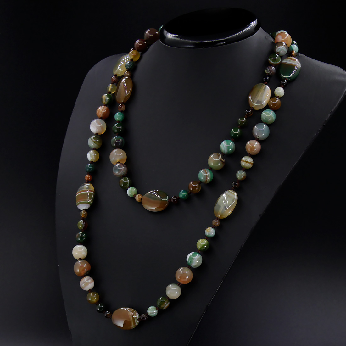 Агат коричнево- зеленый, разноразмерные круглые с плоскими овалами 18х25мм, бусы "Стихия", длина бус 130см