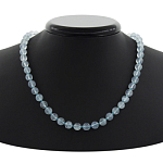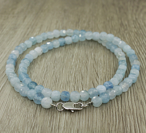 Огранка бусин природного аквамарина в форме додекаэдра эффектно показывает рисунок камня, и бусы загадочно мерцают. Размер бусин - около 5,5мм, длина бус 46см.