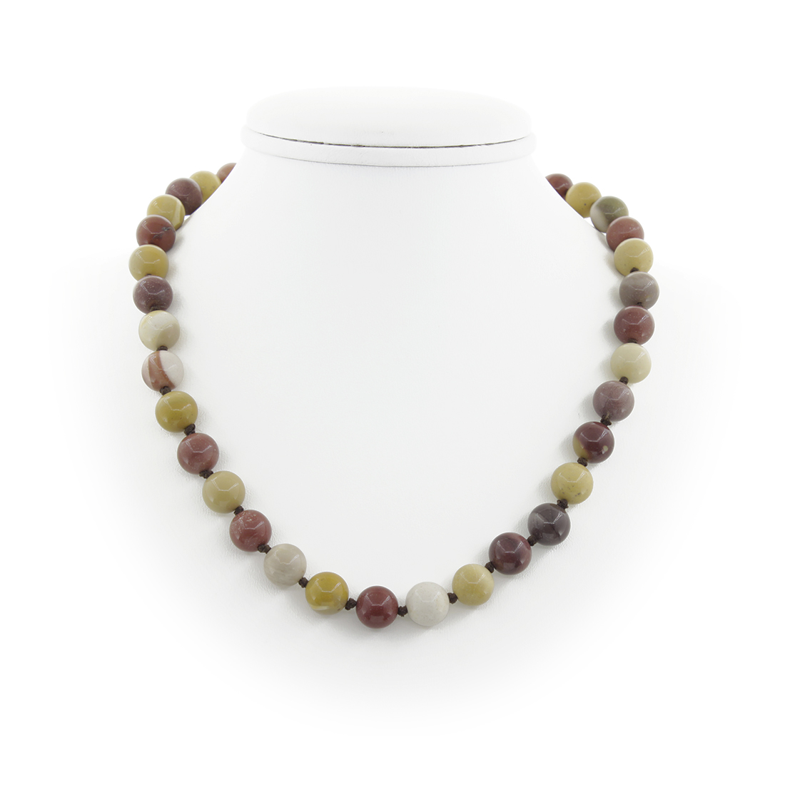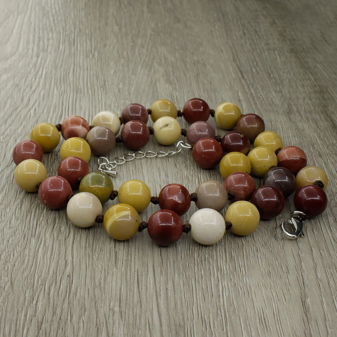Бусы из мукаита, покрытые ювелирным лаком. Украшение на нити, с узелками через каждую бусину. Диаметр бусин 10мм, длина изделия 45см, регулируется до 50см за счёт цепочки.