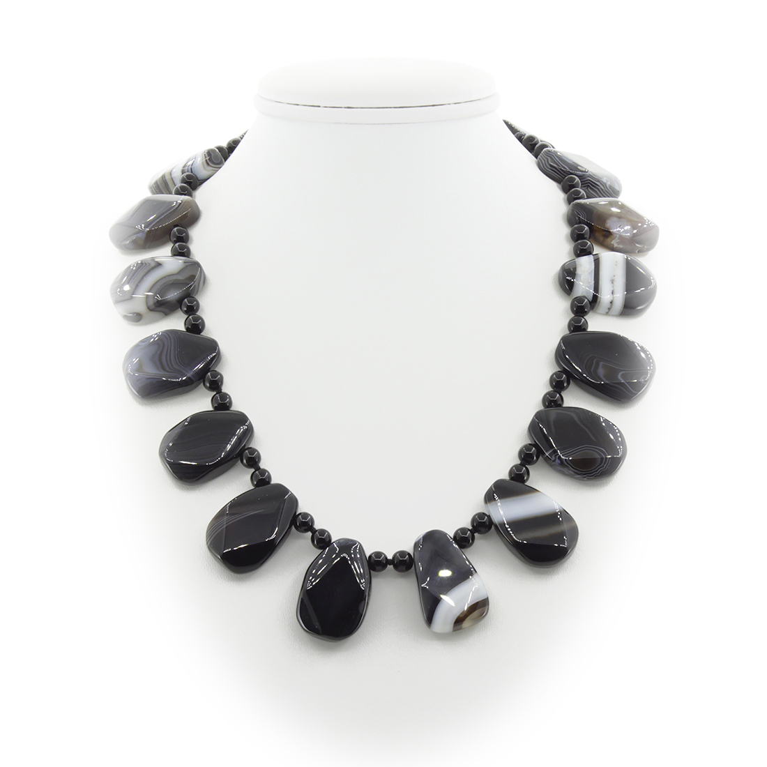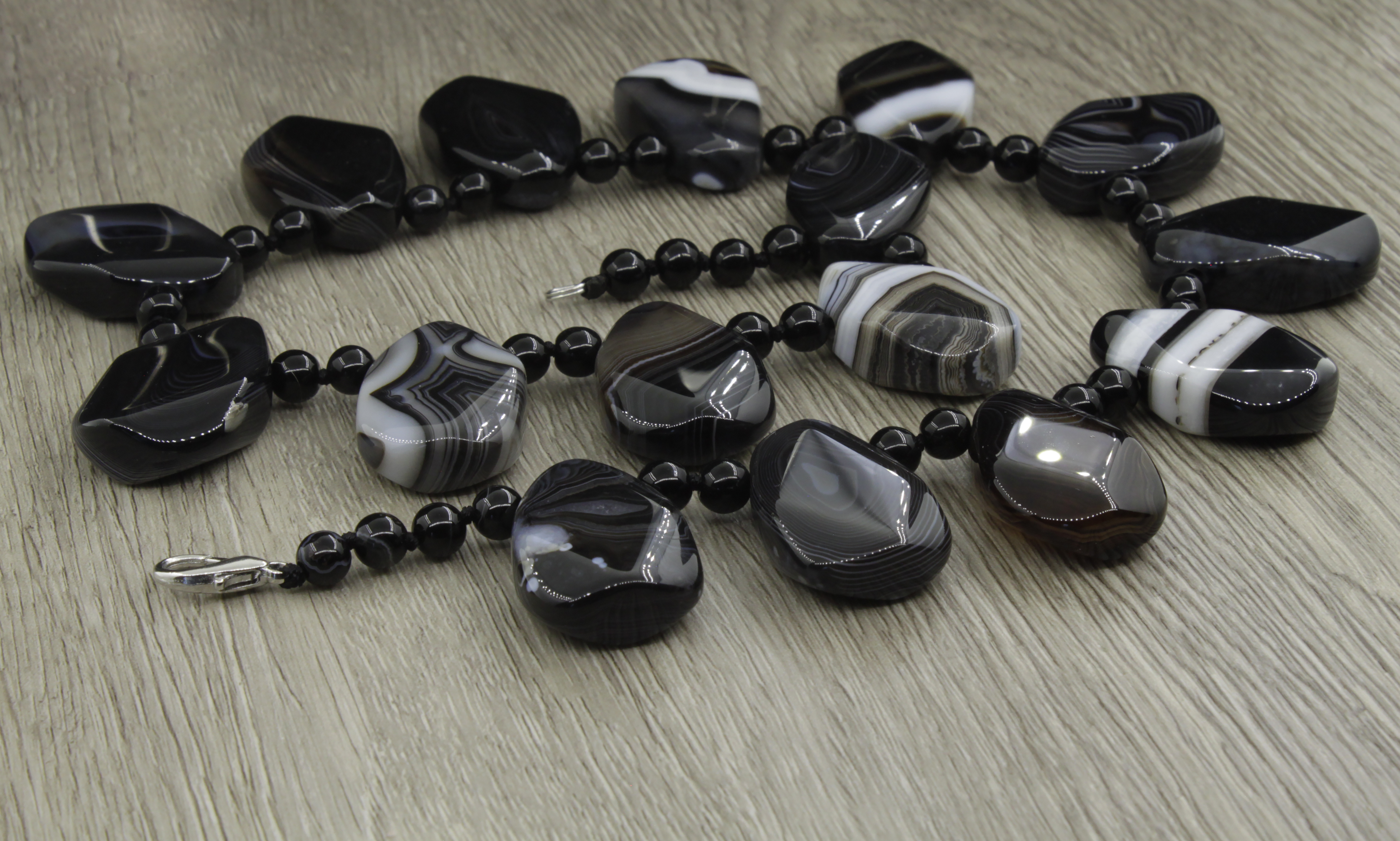 Агат черный полосатый, лепестки через шарик "Лея" бусы длиной 50см