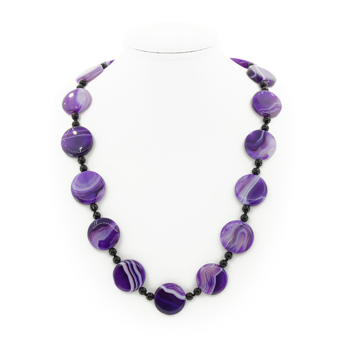 Яркие бусы из агата — заметное украшение, которое подчеркнет Вашу индивидуальность. Диаметр плоских круглых бусин около 29мм, бусин-шариков 6мм. Длина бус 67см.