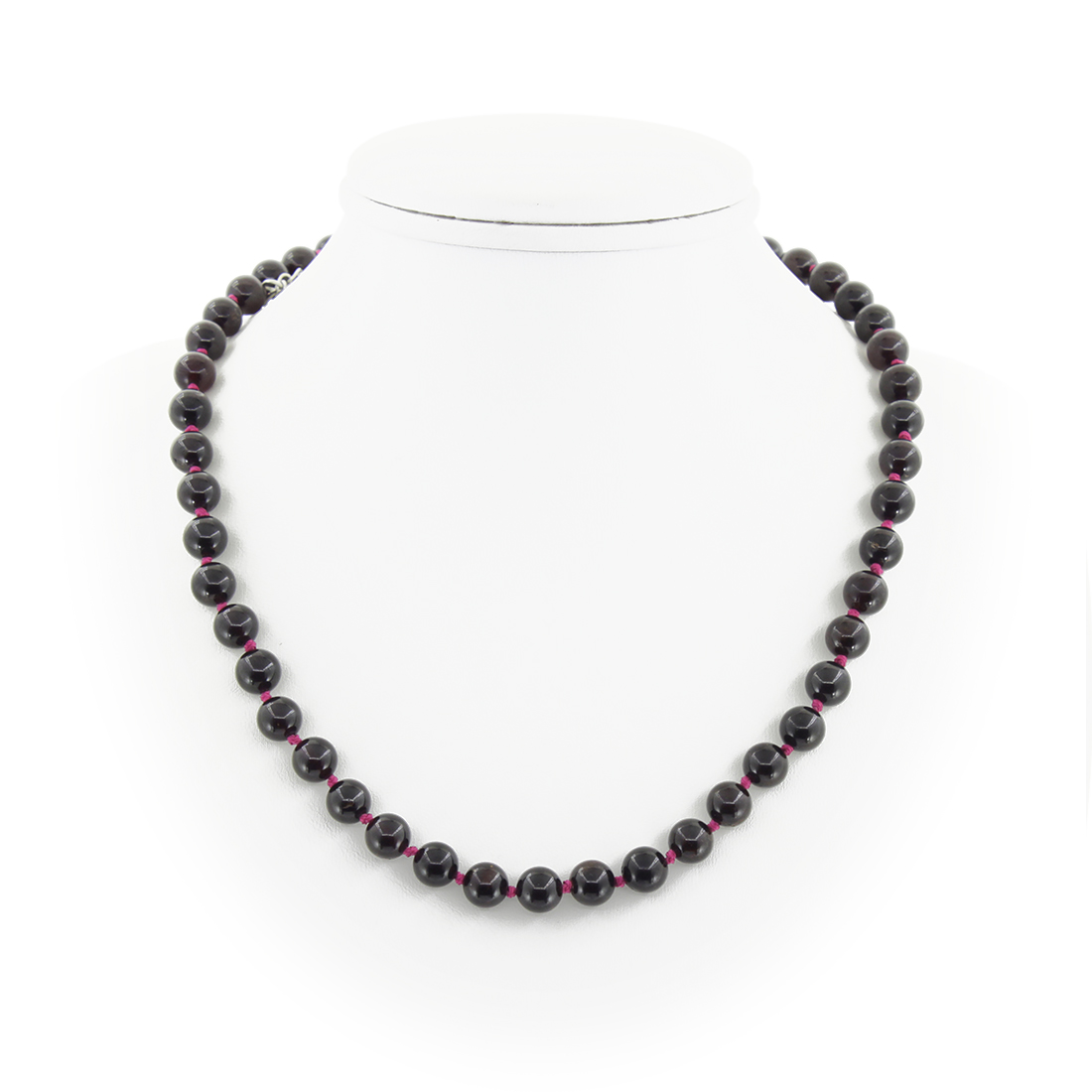 Изящные бусы из натурального индийского граната дополнят Ваш повседневный или праздничный образ. Украшение на нити, с узелками через каждую бусину и замком-карабином из ювелирного сплава. Диаметр бусин 8мм. Длина бус 45см, регулируется до 50см за счёт цепочки.