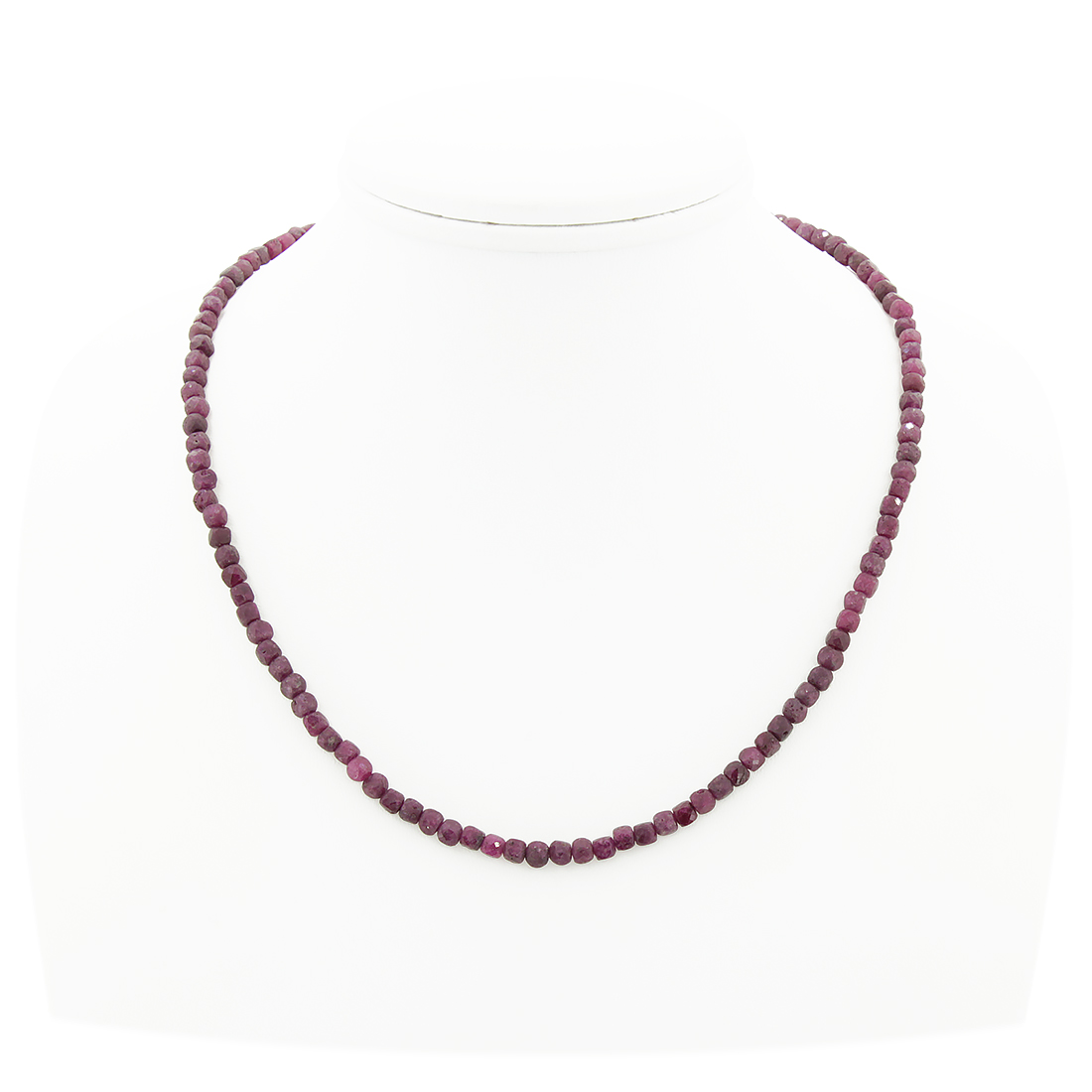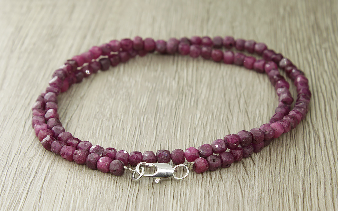Огранка бусин натурального рубина в форме додекаэдра эффектно показывает рисунок камня, и бусы загадочно мерцают. Длина бус 47см, размер бусин - около 3.5мм