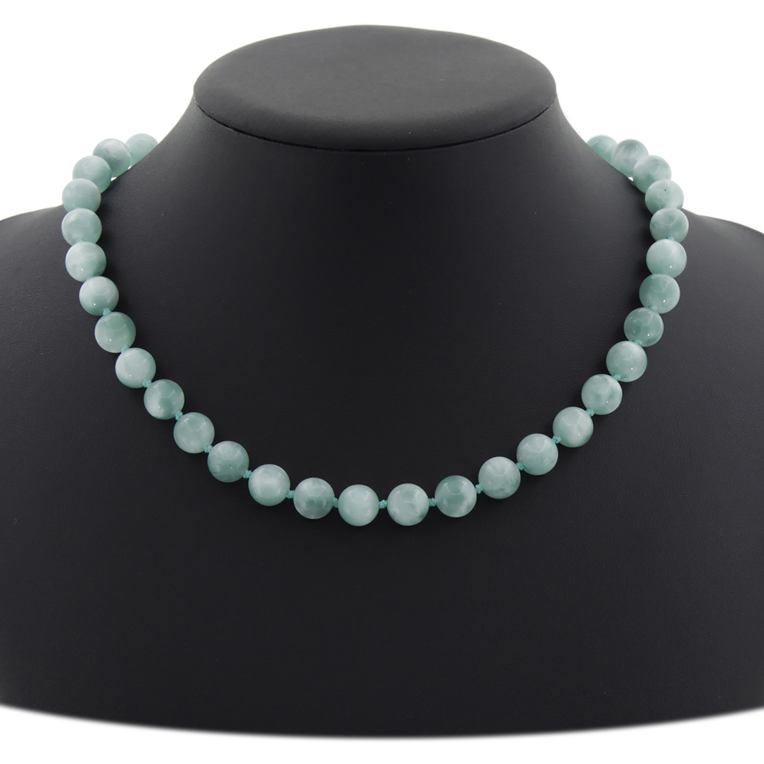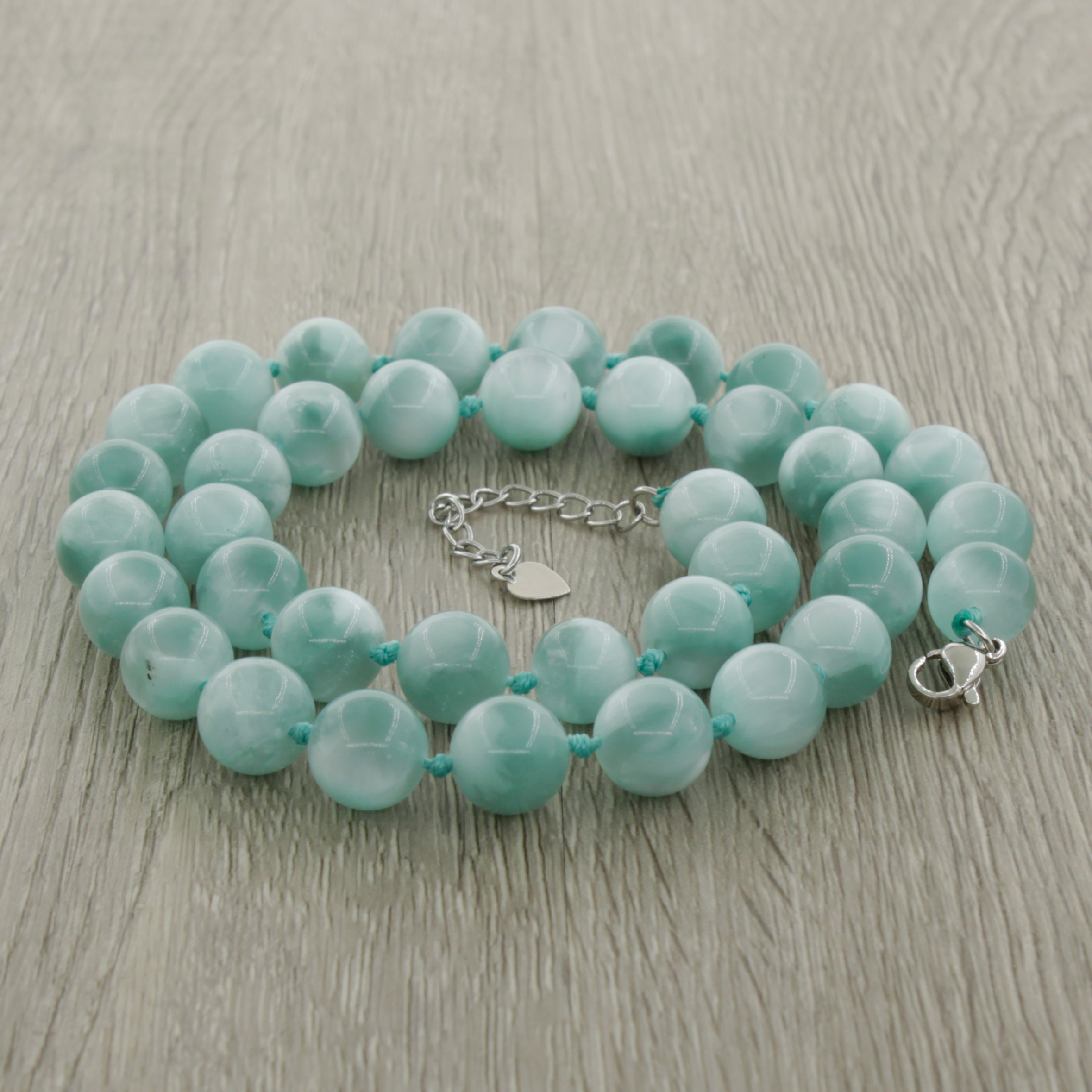 Бусы из натурального ангелита, бусины диаметром 10мм. Украшение на нити, с узелками через каждую бусину. Длина бус 46см, регулируется до 50см за счёт цепочки.