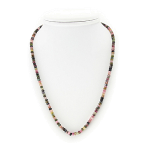 Бусы выполнены из натурального турмалина. Мелкая огранка каждой бусинки придает украшению изумительное сияние. Необычная форма бусин придаёт изделию строгий вид. Длина украшения 48см, диаметр бусин 5мм.