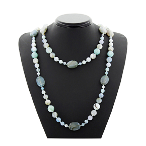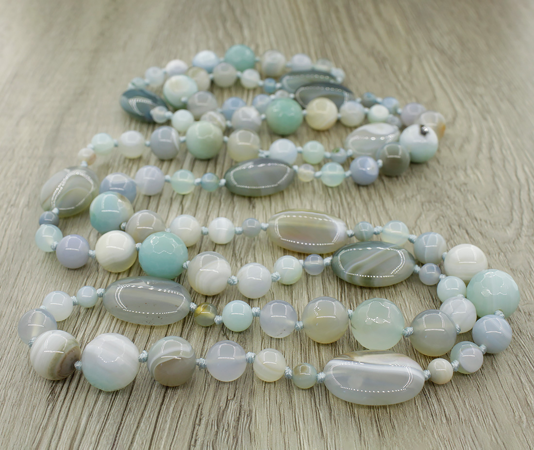 Агат светло-голубой (Бразилия), разноразмерные круглые с плоскими овалами 18х25мм, бусы "Стихия", длина бус 130см