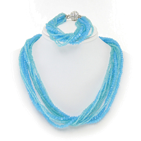 Роскошный коплект из нитей мелких бусин голубого чешского стекла. Носите бусы и браслет, скрутив их в тугой жгут или же россыпью сверкающих нитей. А соединив оба украшения магнитными застежками, можно носить их в виде длинного колье. Мелкая огранка придает каждой бусине мягкое сияние, магнитная застежка со стразами не только очень красива, но и удобна. Длина бус 48см, браслета-20см. Металл: ювелирный сплав