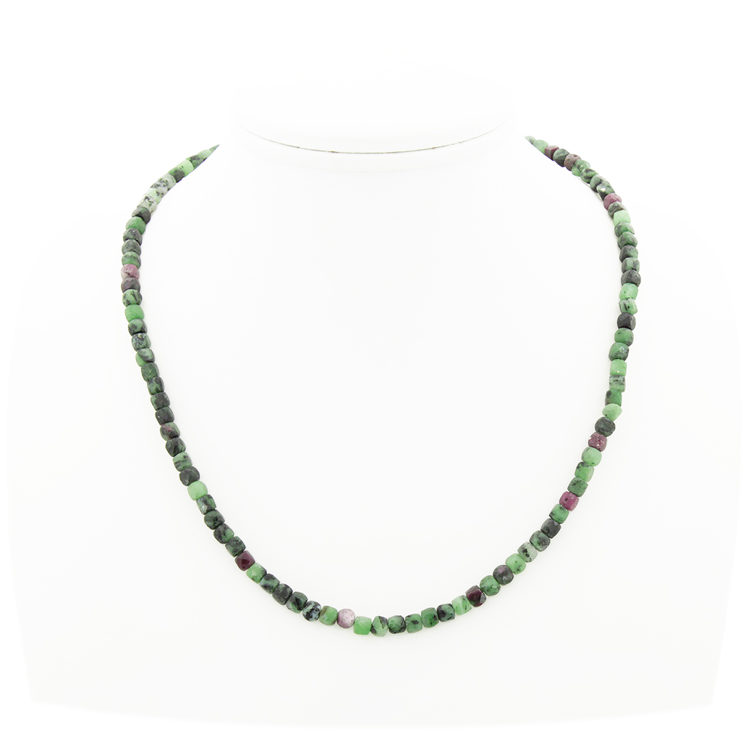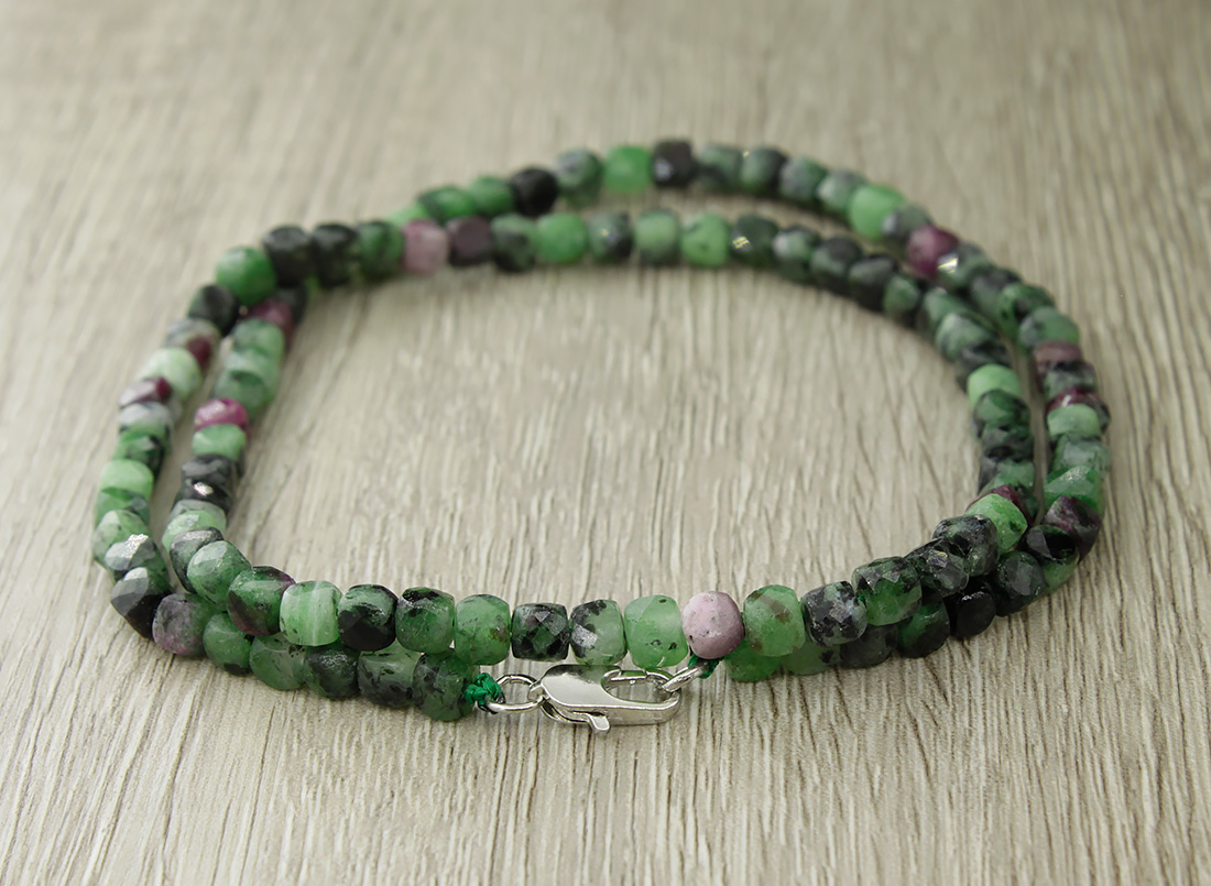 Огранка бусин натурального цоизита в форме додекаэдра эффектно показывает рисунок камня, и бусы загадочно мерцают. Длина бус 47см, размер бусин - около 4.5мм.