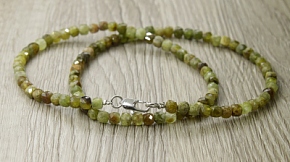 Огранка бусин зелёного граната (гроссуляра) в форме додекаэдра эффектно показывает рисунок камня и загадочно мерцает. Длина бус 50см.