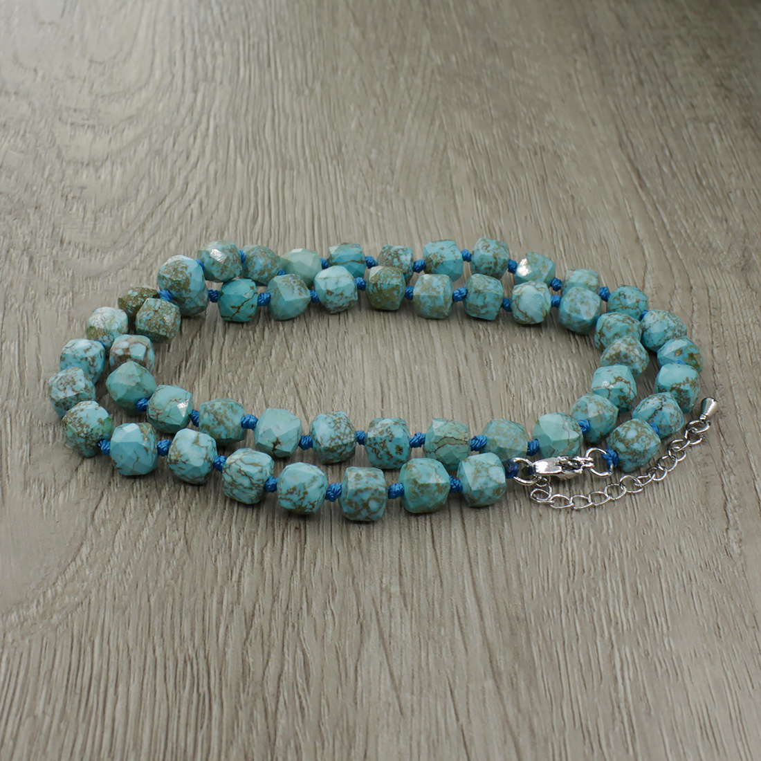 Огранка бусин бирюзы в форме додекаэдра эффектно показывает рисунок камня, и бусы загадочно мерцают. Бусы на нити, с узелком через каждую бусину. Длина 46-50см, регулируется удлиняющей цепочкой, размер бусин - около 7мм