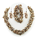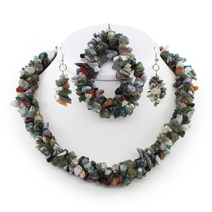 Изделия сплетены из трех ниток гальки натуральной зеленой яшмы. Длина бус 45 - 53см, браслета 19 - 23см (регулируется с помощью цепочки). Длина сережки с крючком 5см.