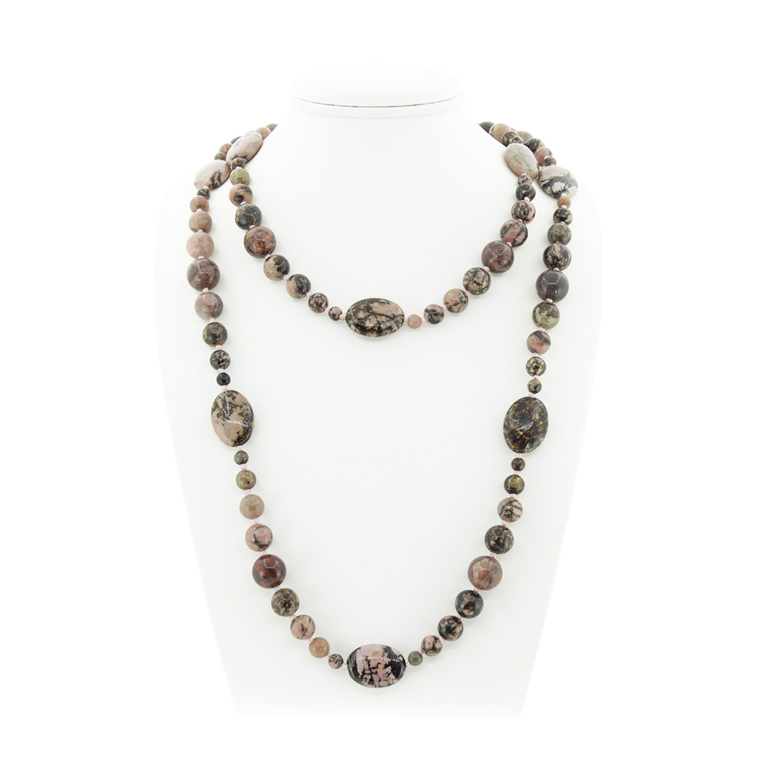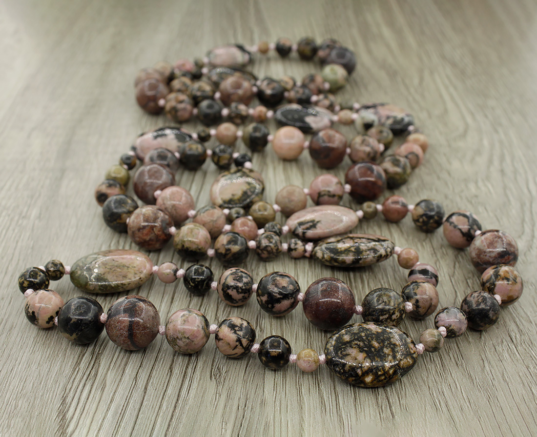 Родонит (Россия), разноразмерные круглые с плоскими овалами 18х25мм, бусы "Стихия", длина бус 128см