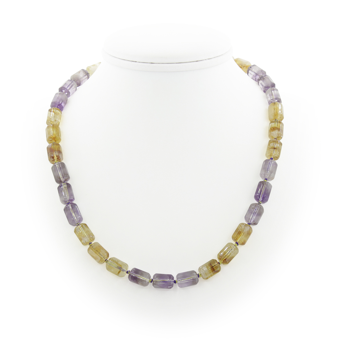 Бусы из цитрина и аметиста в форме граненых бочонков. Размер бусин 11,5х8мм, длина изделия 46см.