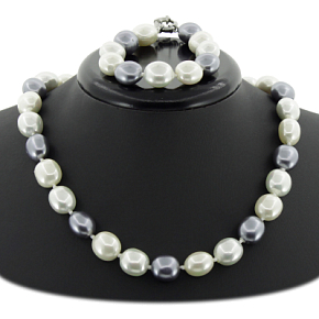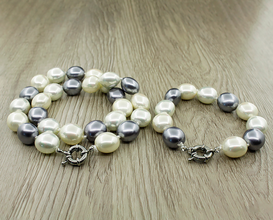 Майорка белая и серая, овальные бусины 13x15мм, бусы 46см + браслет 19см