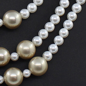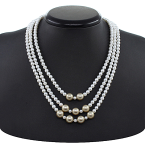 Украшение выполнено из натуральной белой и золотой майорки в строгом аристократическом стиле. Диаметр маленьких бусин 5мм, а крупных 10мм. Длина колье 44см.