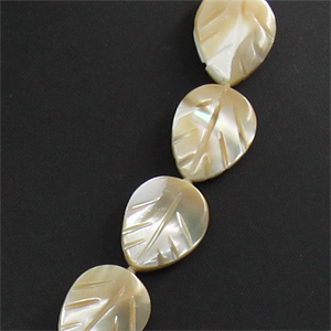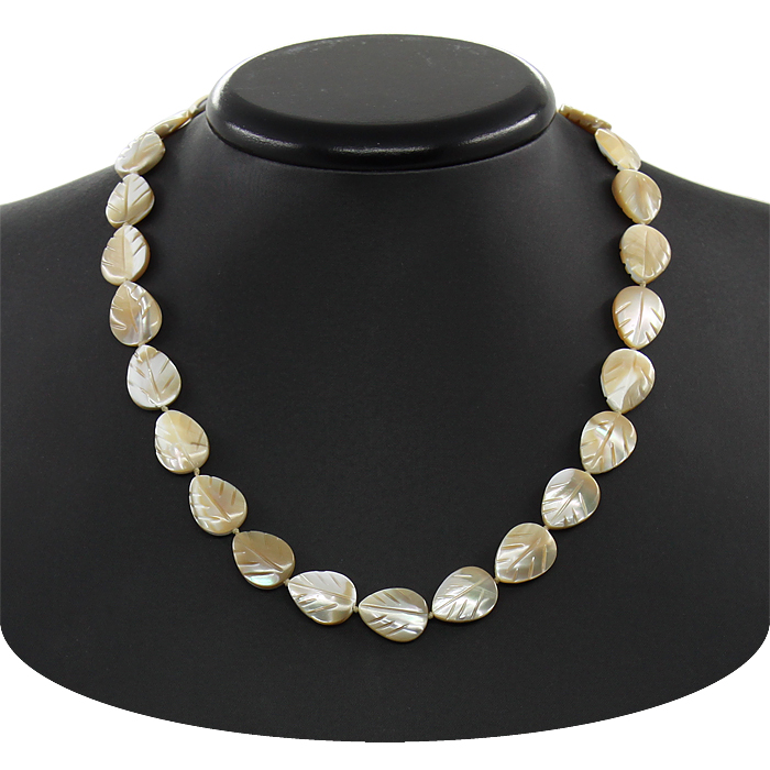 Листики вырезаны из настоящего бежевого перламутра. Размер листочков 12х15мм, длина бус 47см, регулируется до 51см за счёт цепочки..