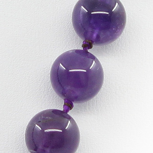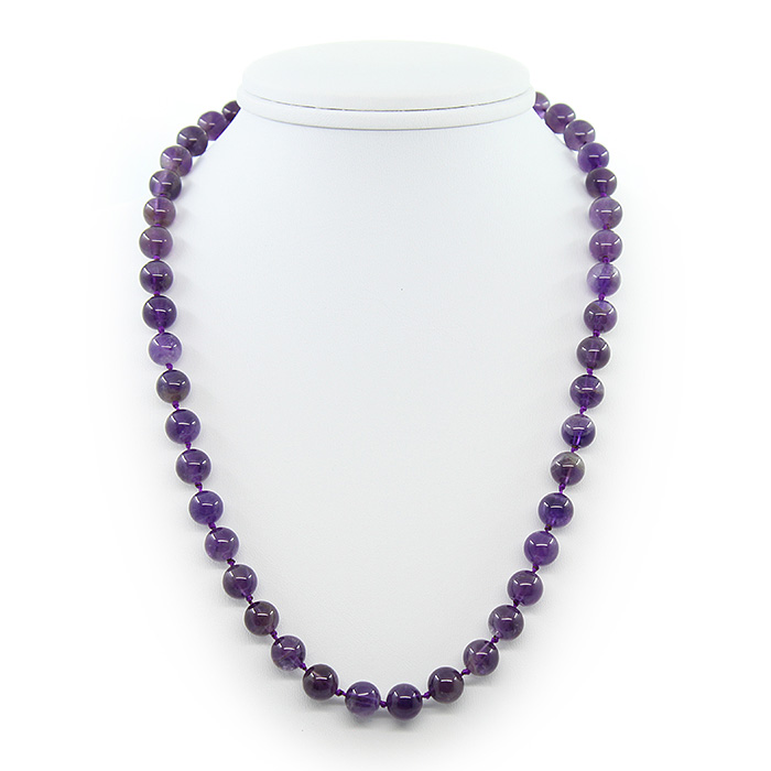 Бусы из натурального аметиста. Украшение на нити, с узелками через каждую бусину и замком-карабином из ювелирного сплава. Диаметр бусин 8мм. Длина бус 45см, регулируется до 50см за счёт цепочки.