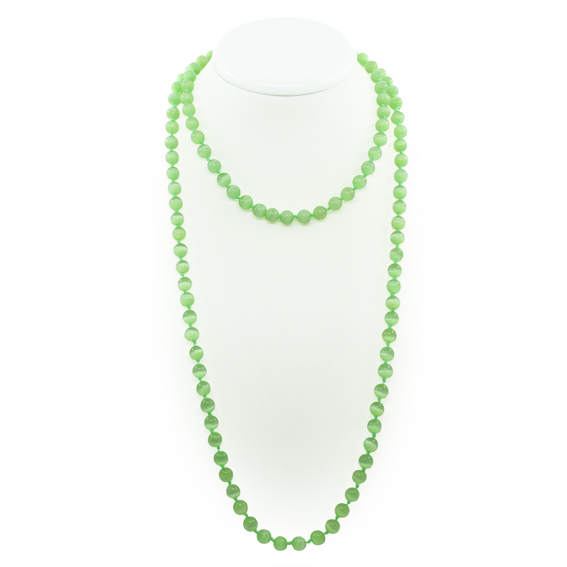 Нежные бусы из салатового кошачьего глаза. Длина бус позволяет обернуть их вокруг шеи два раза или завязать узлом. Диаметр бусин 8мм, длина изделия 115см.