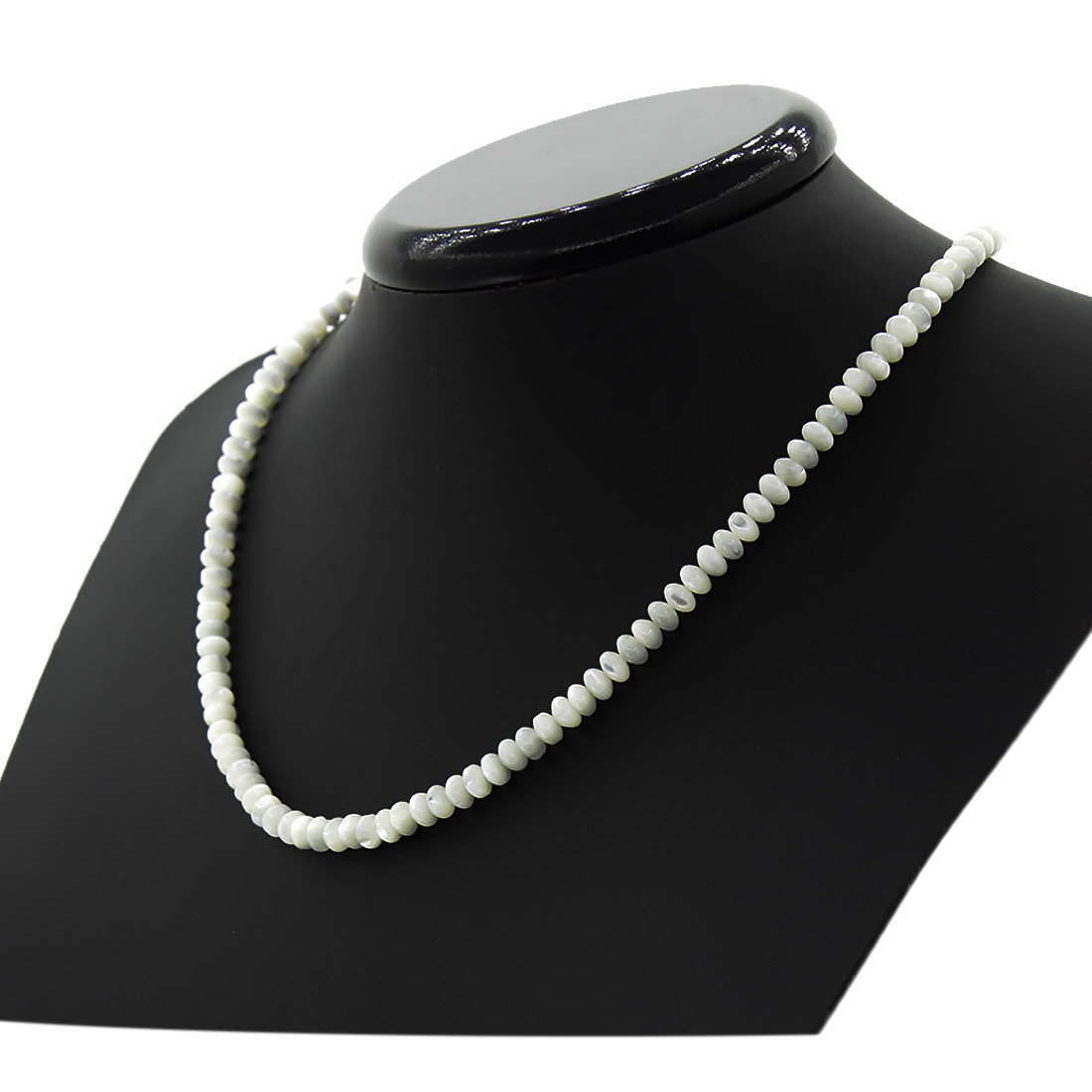 Бусы из натурального перламутра. Размер бусин примерно 6мм. Длина бус 47-53см, регулируется удлиняющей цепочкой. На бусинах имеются неровности из-за структуры перламутра и формы бусин.