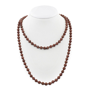 Классические бусы из искусственного коричневого авантюрина. Сияющие бусины с огранкой нанизаны на прочную шелковую нить через узелок. Длина нити позволяет обернуть бусы вокруг шеи два раза или завязать узлом. Диаметр бусин 8мм, длина изделия 115см.