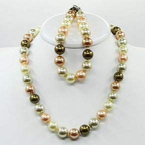 Комплект Бусы и браслет майорка mix зеленый с золотистым, круглые 12мм, короткие 47см