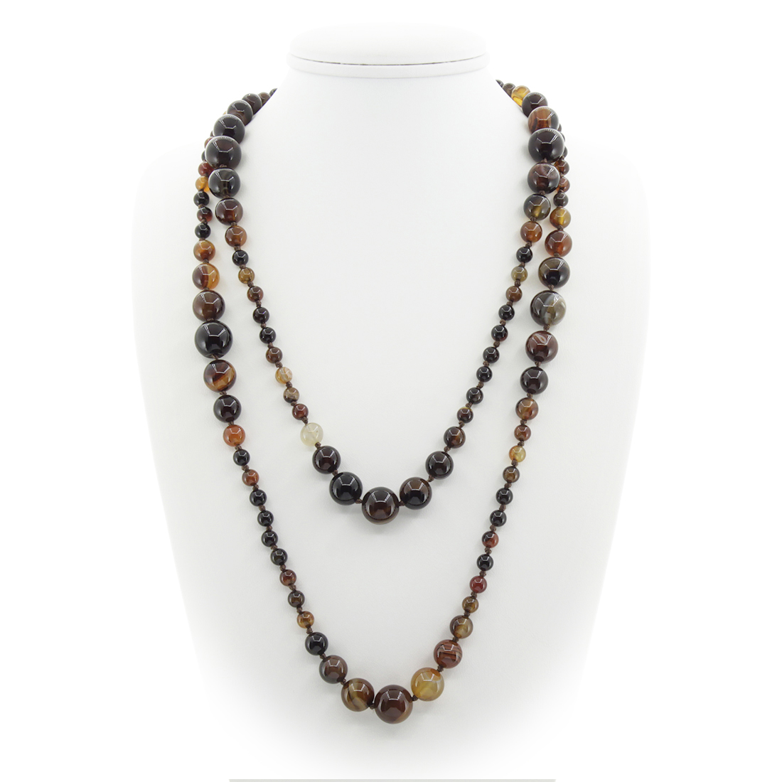 Яркие и гармоничные бусы из натурального коричневого агата длиной 130см. В этих бусах удачно подобраны бусинки разных размеров от 6 до 14мм.