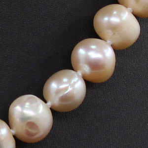 Крупный розовый жемчуг с бороздками. Диаметр жемчужин 8-9мм, длина бус 47см.