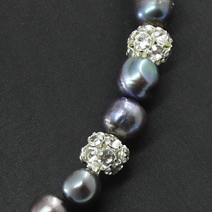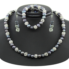 Данный набор состоит из бус, браслета и сережек из натурального черного жемчуга, дополненного металлическими вставками со стразами в форме шара. Диаметр жемчужин 9мм. Длина бус 45см, длина браслета 19см.