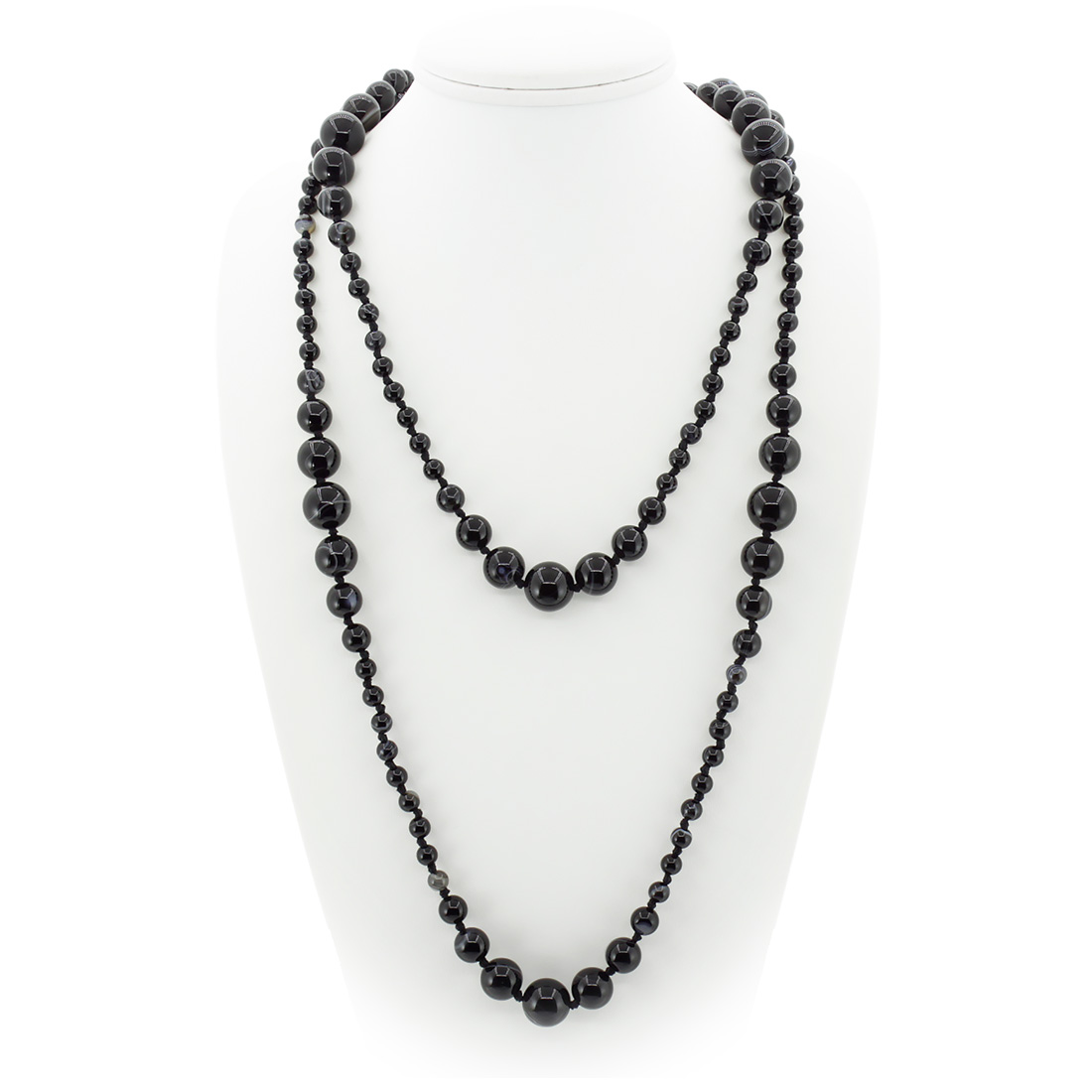 Яркие и гармоничные бусы из натурального чёрного агата длиной 150см. В этих бусах удачно подобраны бусинки разных размеров от 6 до 14мм.