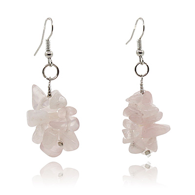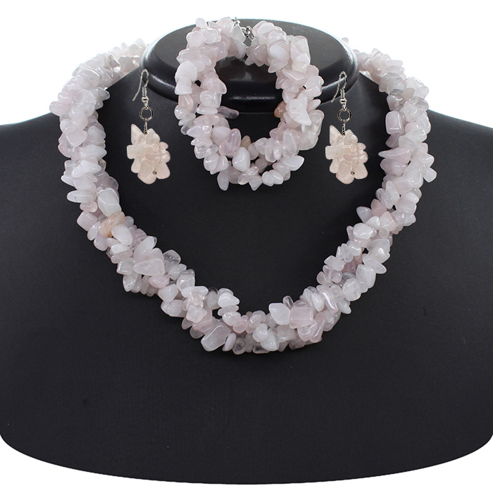Изделия сплетены из трех ниток гальки натурального розового кварца. Длина бус 45 - 53см, браслета 19 - 23см (регулируется с помощью цепочки). Длина сережки с крючком 5см.