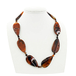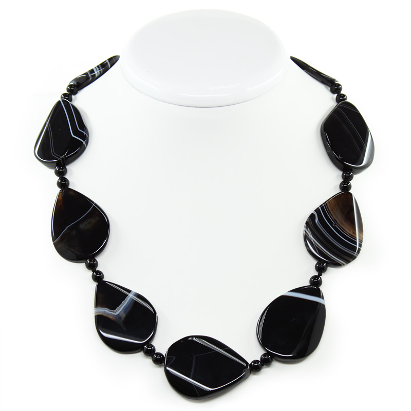 Агат черный с белыми полосками. Бусины в форме капель собраны через два шарика диаметром 6мм, размер капель 27х40мм. Длина изделия 54см.