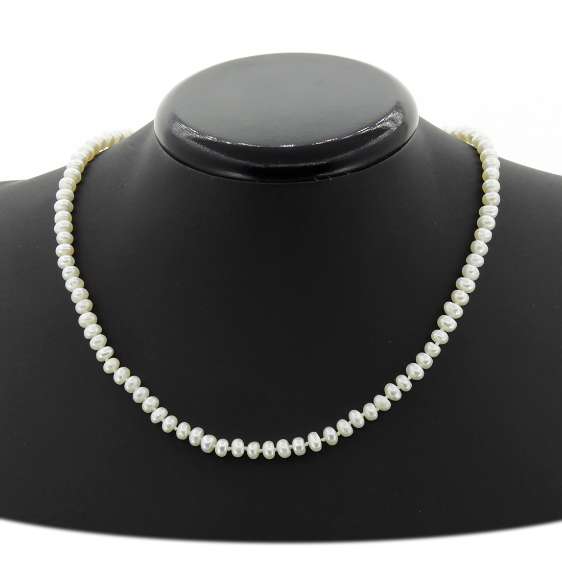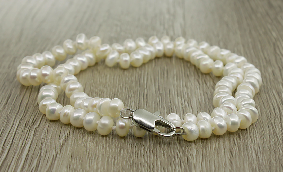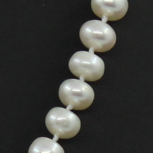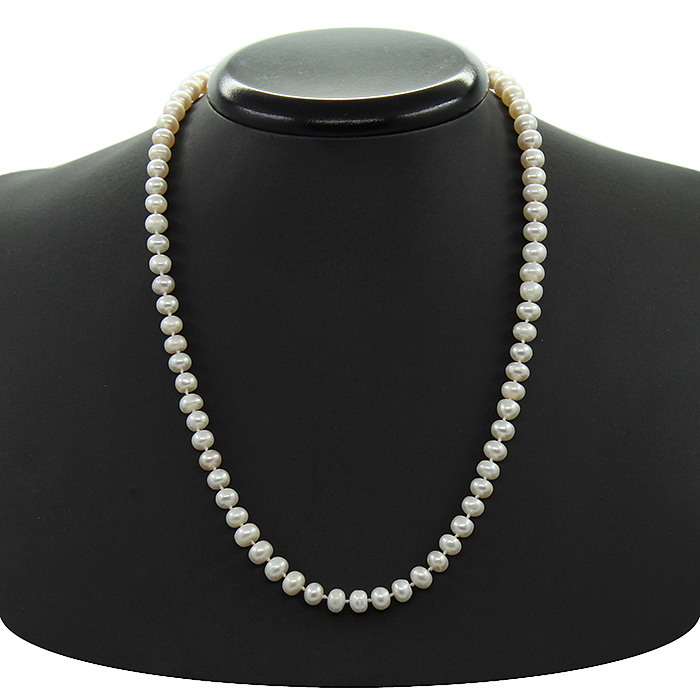 Жемчужные бусы из натурального белого жемчуга сплюснутой формы. Размер бусин 6мм, длина изделия 46см.
