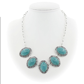 Легкое и изящное украшение со вставками из бирюзы (имитация). Длина колье регулируется с помощью цепочки от 48 до 55см.