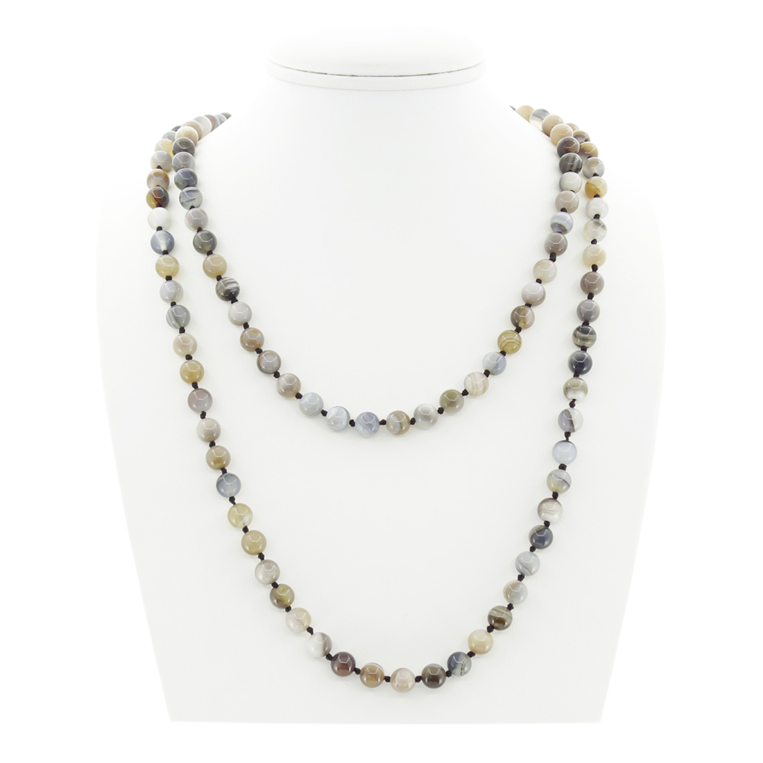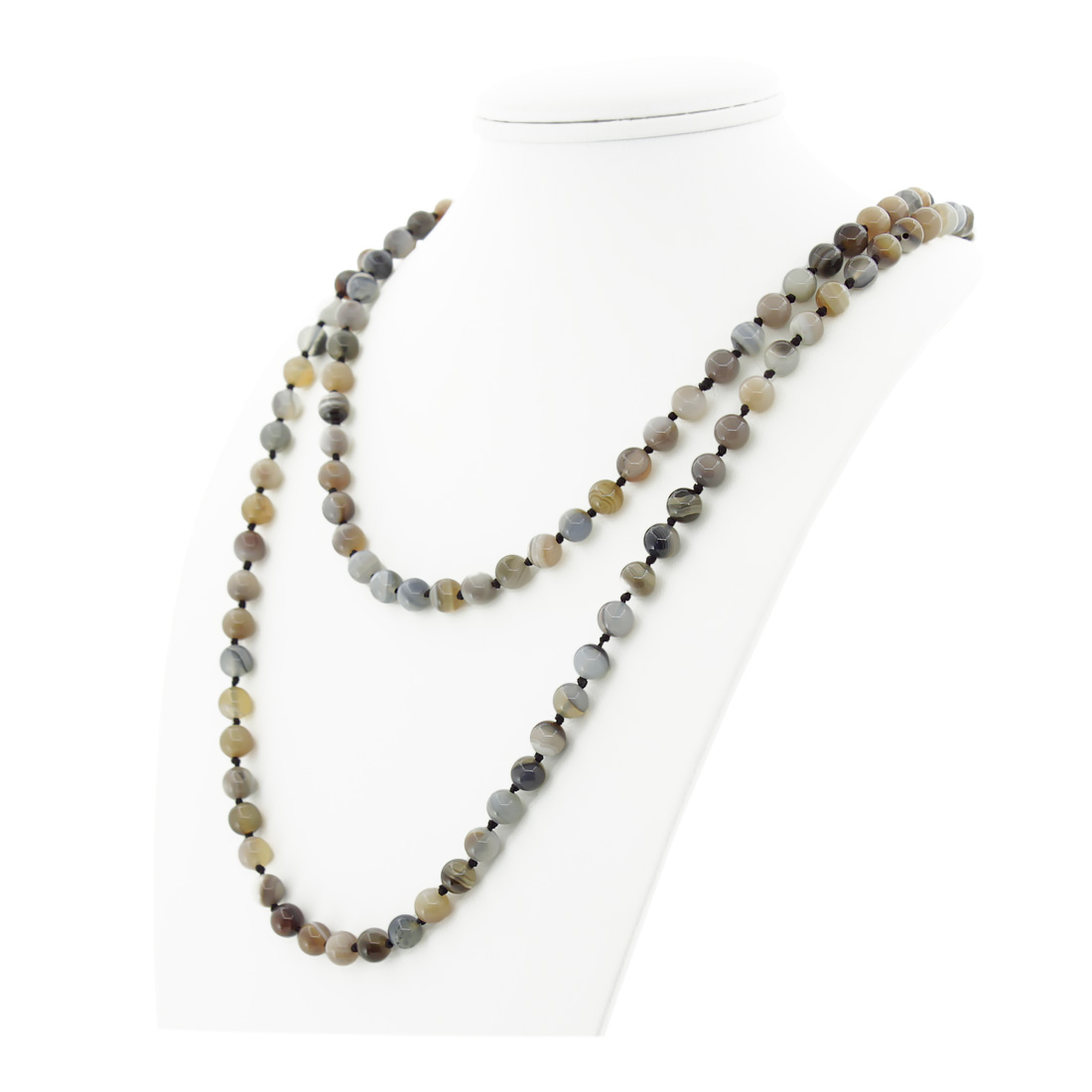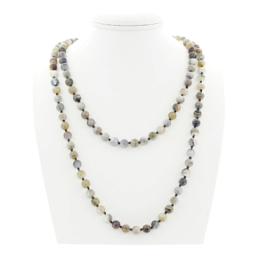 Запоминающиеся бусы из натурального серого агата прекрасно дополнят Ваш вечерний образ. Длина бус позволяет обернуть их вокруг шеи два раза или завязать узлом. Диаметр бусин 8мм, длина бус 124см.