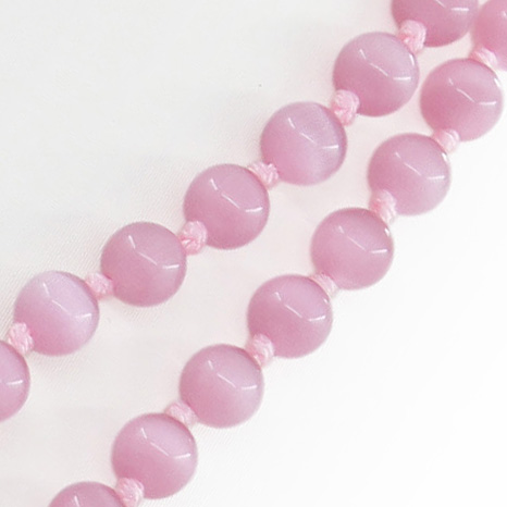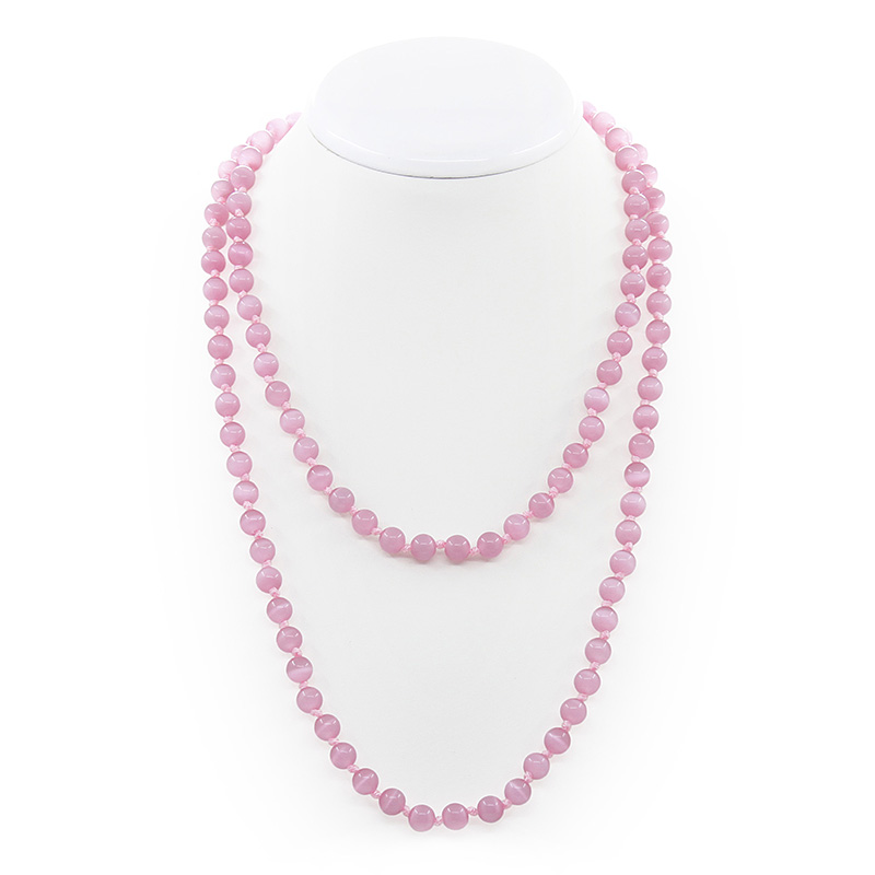 Яркие бусы из розового кошачьего глаза. Длина бус позволяет обернуть их вокруг шеи два раза или завязать узлом. Диаметр бусин 8мм, длина изделия 130см.