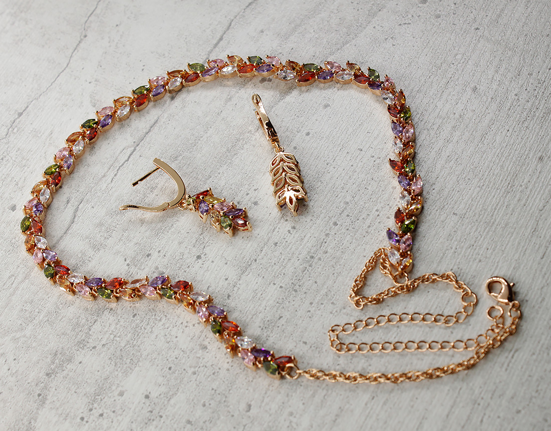 В этот замечательный комплект входят серьги и колье с фианитами. Длина колье 50-57см, регулируется с помощью удлинняющей цепочки. Длина серёжки вместе с застёжкой 4см.