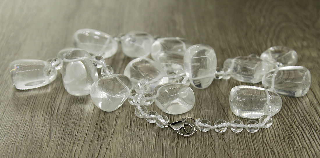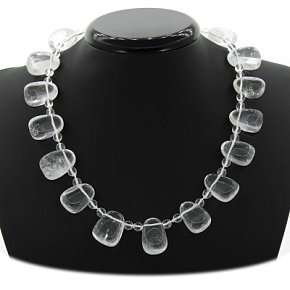 Украшение в строгом стиле из натурального горного хрусталя. Следует учитывать, что бусы немного тяжелее обычных. Размеры бусин-лепестков от 22мм на 16мм, длина бус 50см. Цвет и рисунок может незначительно отличаться.