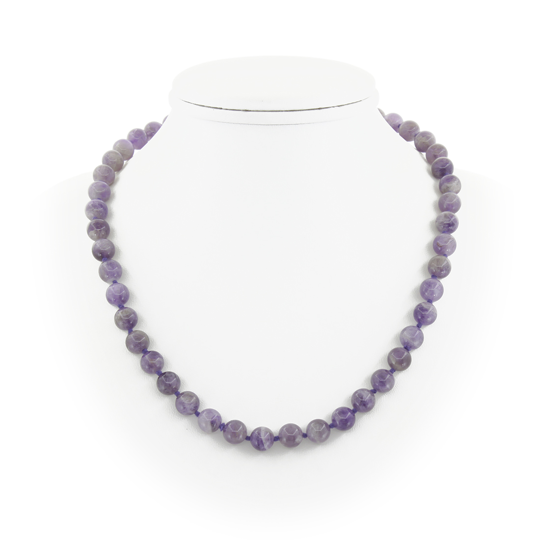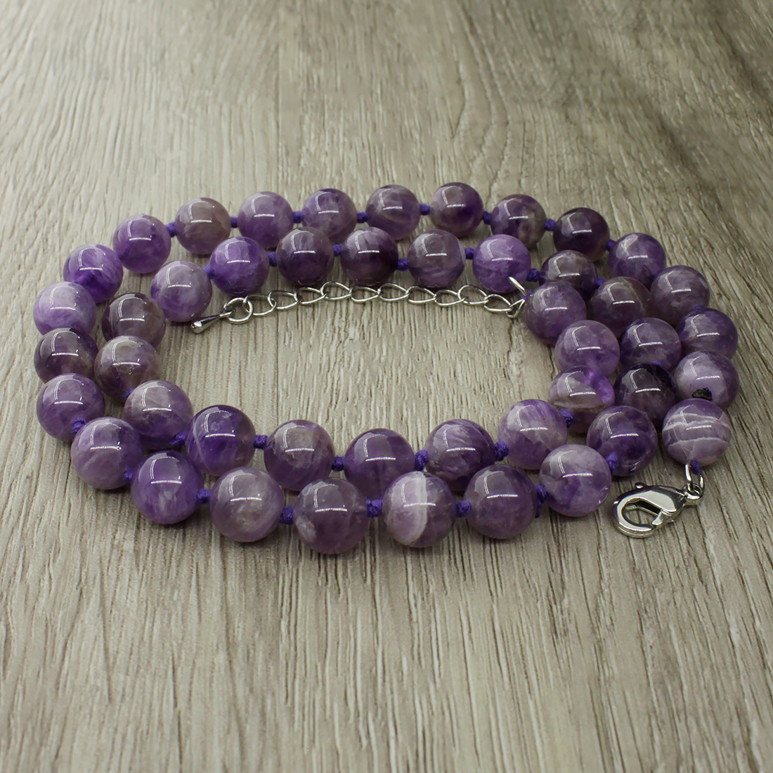 Бусы из натурального аметиста. Украшение на нити, с узелками через каждую бусину и замком-карабином из ювелирного сплава. Диаметр бусин 8мм. Длина бус 45см, регулируется до 50см за счёт цепочки.