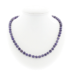 Бусы выполнены из натурального чароита. Размер бусин 7мм. Длина бус 46см, удлиняется с помощью цепочки.