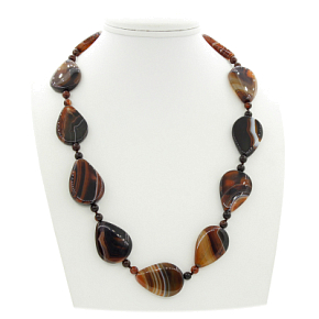 Необычная форма бусин в сочетании с интересной расцветкой слоев агата на срезе придает этому украшению изысканный вид. Длина бус 60см.