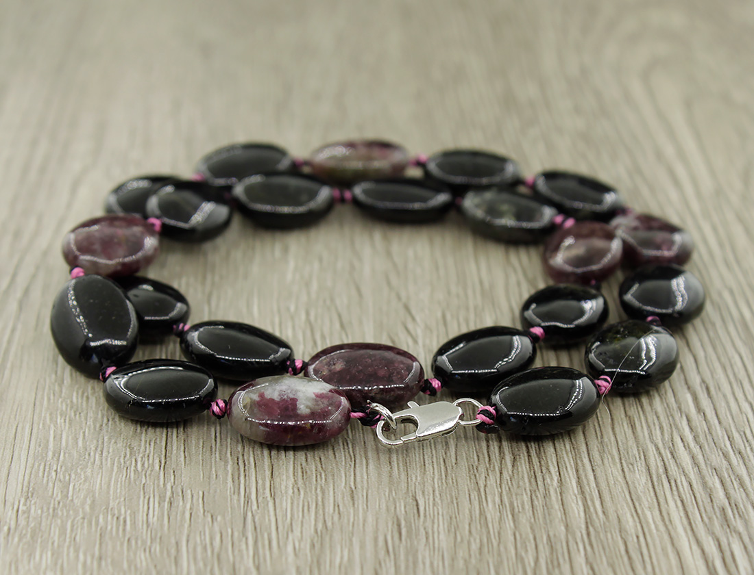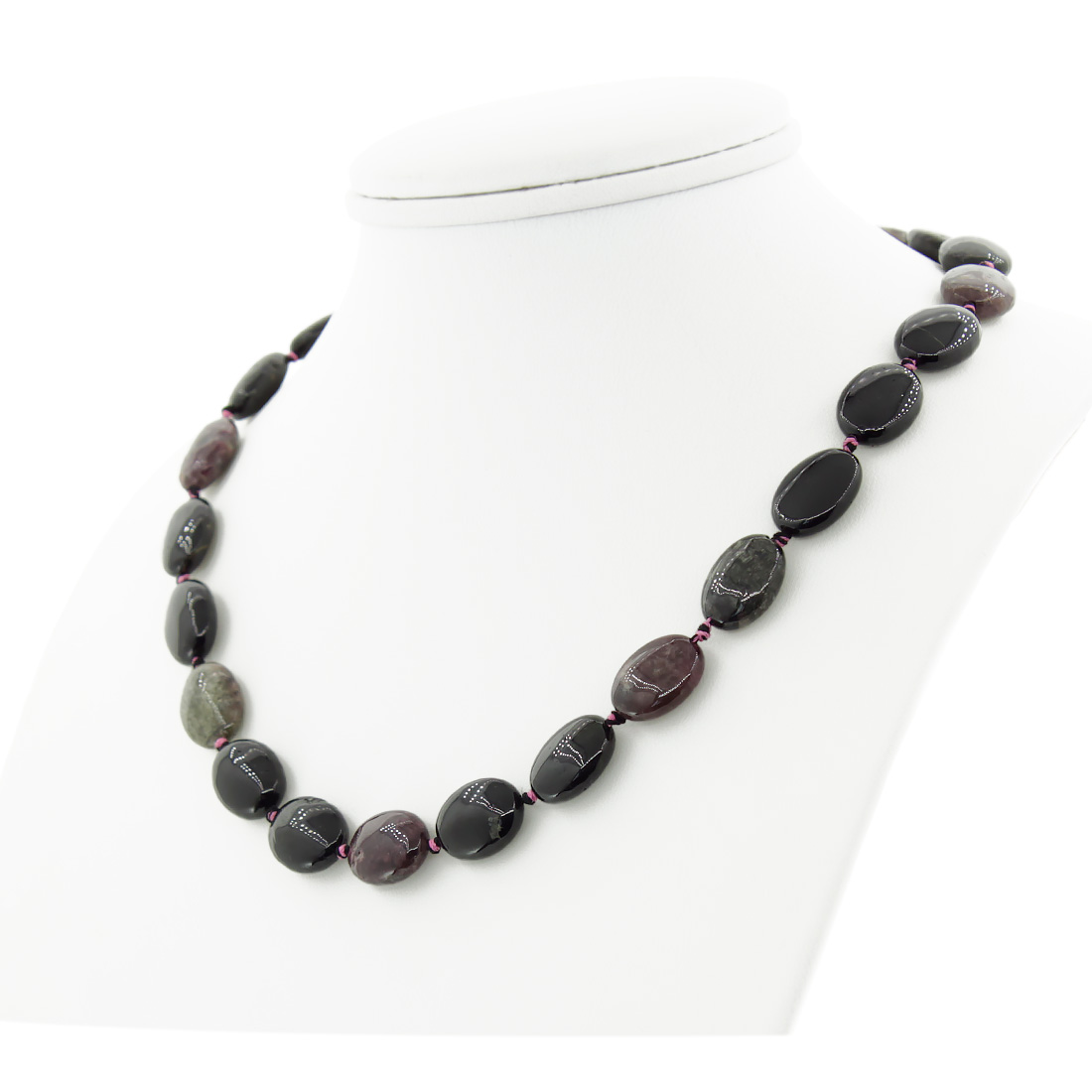 Изящные бусы с узелками из непрозрачного разноцветного и темного турмалина. Бусы станут заметной деталью Вашего образа. Длина бус 47см, размер бусин - около 13х16мм.