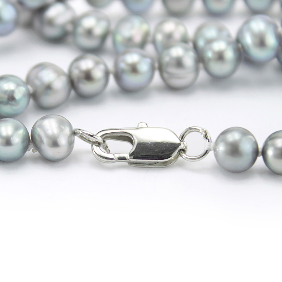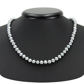Нитка темно-серого жемчуга овальной формы высокого качества с глубоким перламутровым блеском. Длина изделия 45см. Диаметр бусин 6-7мм. застежка: ювелирный сплав.