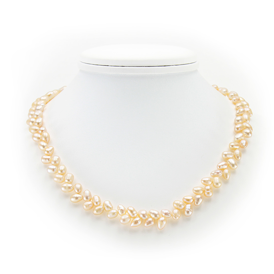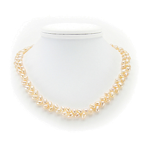 В этом украшении Вы будете блистать на любом торжественном приеме. В изделии используется натуральный белый и розовый жемчуг необычной формы. Размер жемчужин 8х10мм, длина бус 45см.