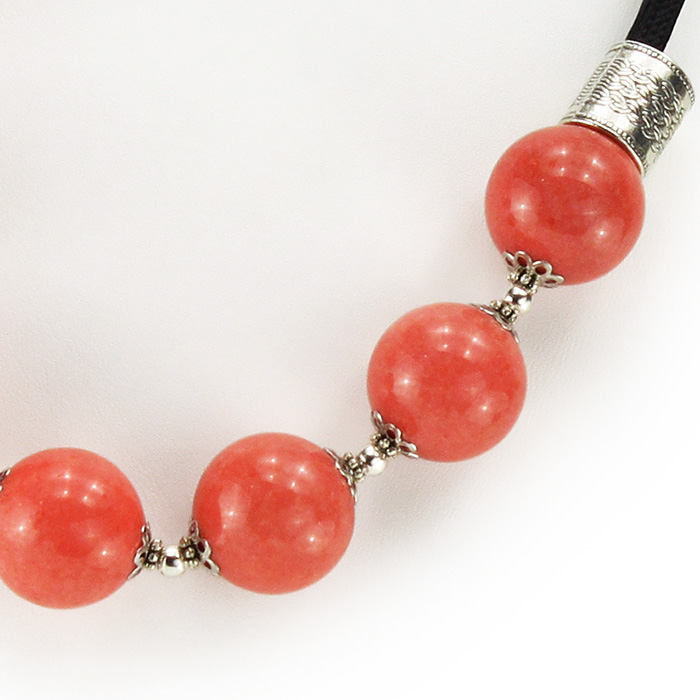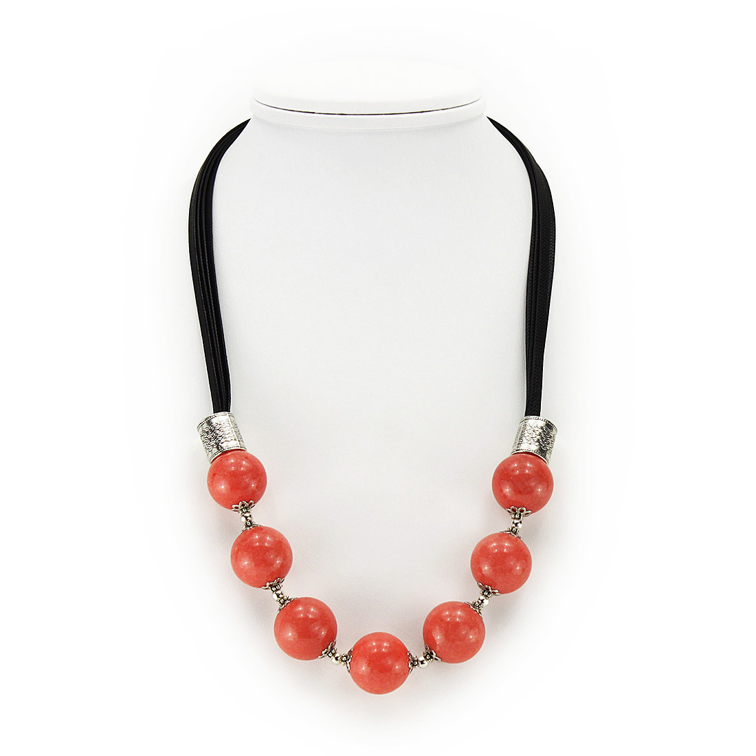 Колье на текстильном шнурке с крупными шариками из имитации камня под розовый коралл. Диаметр шариков 20мм, Длина 52 см. Металлические вставки: ювелирный сплав.