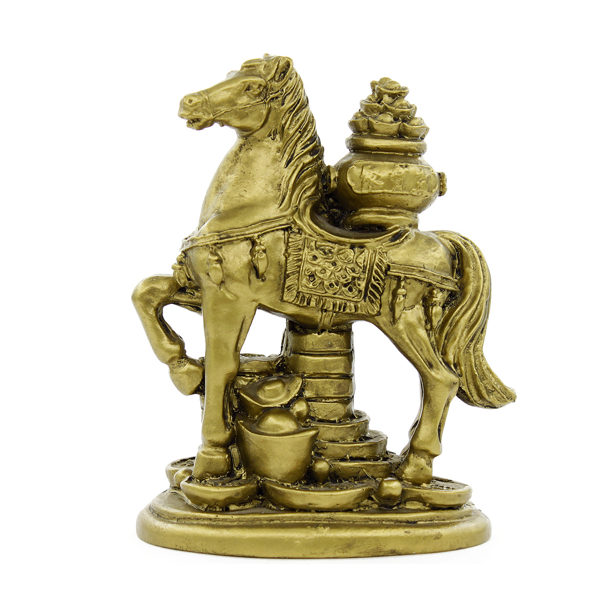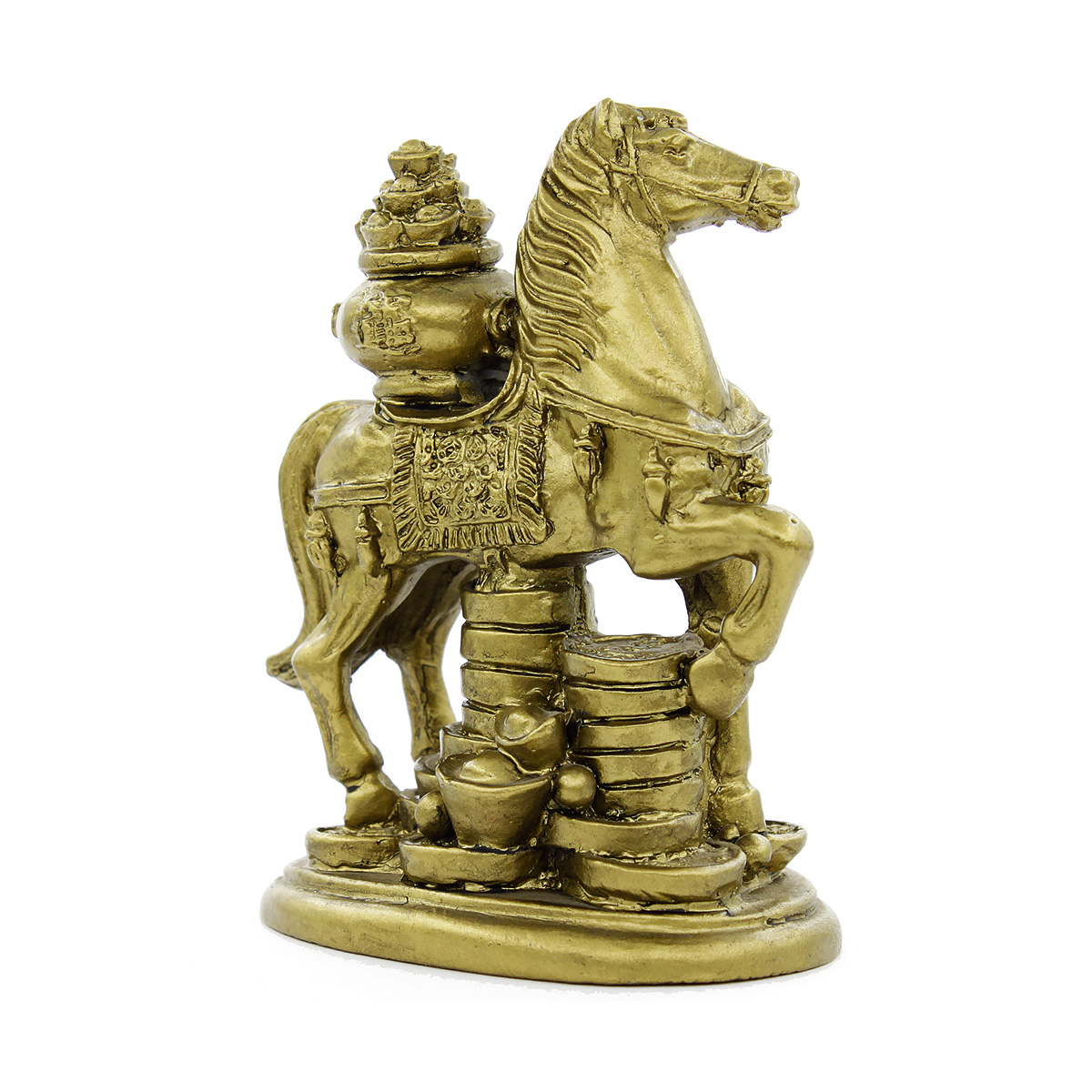 Лошадь стоит на монетах и золотых слитках, на спине держит чашу с золотыми слитками. Согласно фен-шуй это приносит удучу в деньгах и финансовые благополучие. Высота 9см.