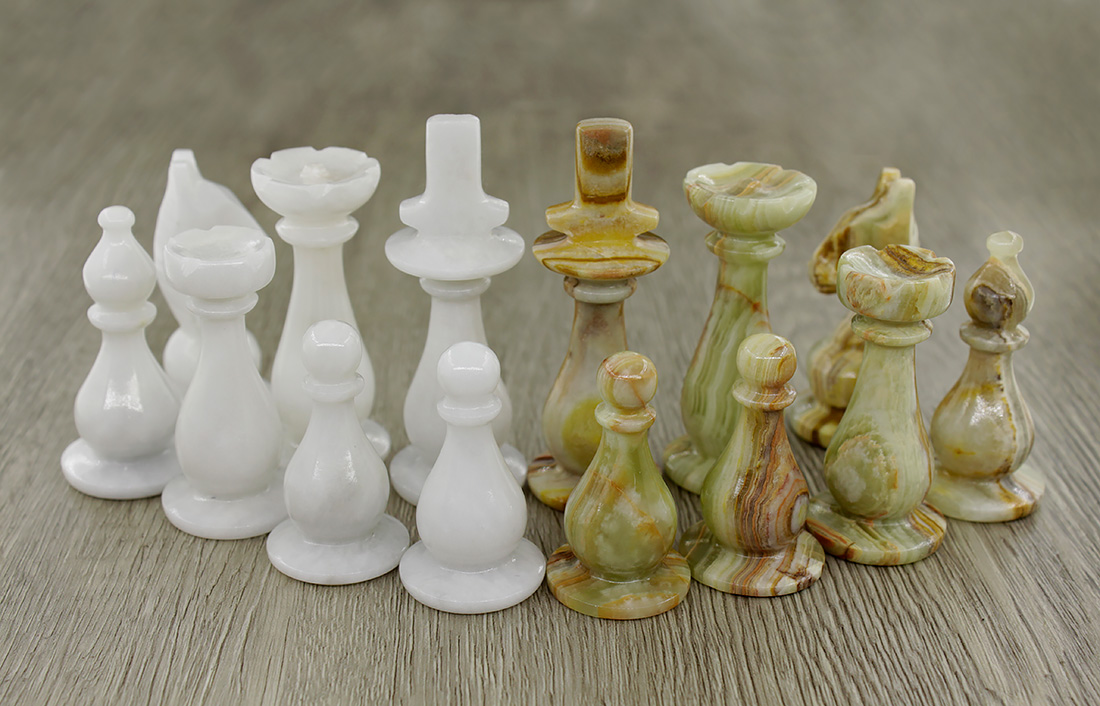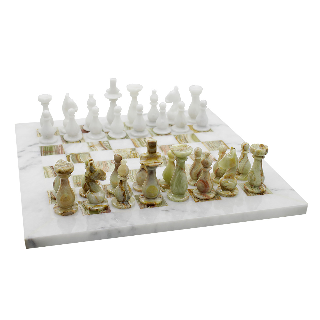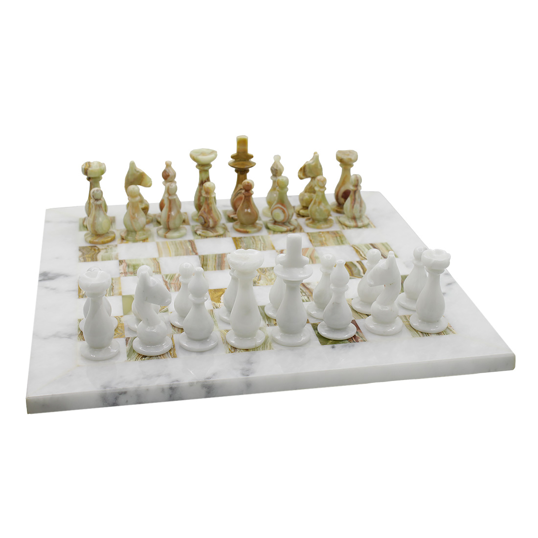 "Белые" выполнены из белого мрамора, а "тёмные" из классического оникса. Высота Короля 7см, диаметр основания фигур 25мм. Доска: размер 30х30см, клетка30х30мм.