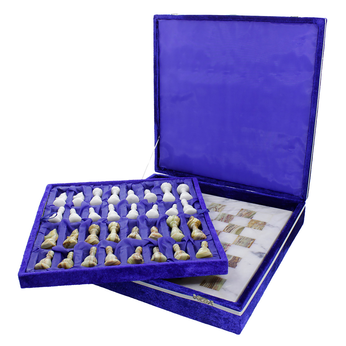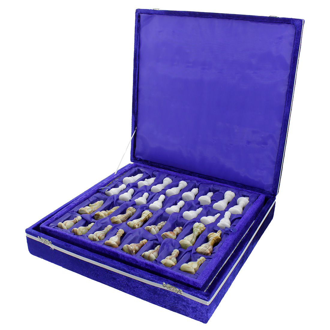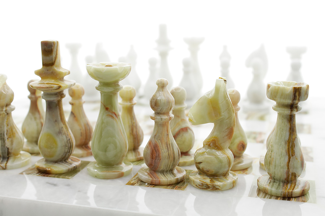 "Белые" выполнены из белого мрамора, а "тёмные" из классического оникса. Высота Короля 7см, диаметр основания фигур 25мм. Доска: размер 30х30см, клетка30х30мм.