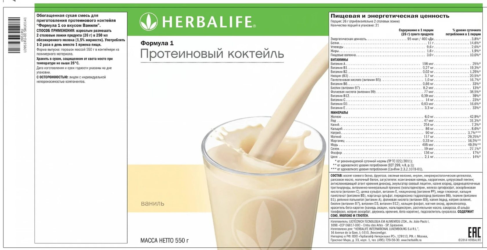 Сухая смесь для приготовления протеинового коктейля. Дополнительный источник белка, витаминов и минеральных веществ, для оптимизации питания, в том числе лицам, контролирующим массу тела. • Эффективность для снижения веса подтверждена клиническими исследованиями.* • Как часть программы снижения веса рекомендуется замена 2 основных приемов пищи в день. • Для оптимизации питания - 1 раз в день в качестве основного приема пищи. Рекомендуется использовать Протеиновый коктейль Формула 1 как часть программы контроля или снижения веса, включающей умеренное потребление калорий, сбалансированный рацион, оптимальное потребление воды и регулярную физическую активность. Продукт предназначен для взрослых. Перед использованием продукта или перед началом любой программы коррекции массы тела рекомендуется проконсультироваться со специалистом. СПОСОБ ПРИМЕНЕНИЯ: взрослым размешать 2 столовых ложки продукта (26 г) в 250 мл обезжиренного молока (1,5% жирности). Употреблять 1-2 раза в день вместо приема пищи. Форма выпуска: порошок массой 550 г в контейнере из полимерного материала. Рекомендуется хранить в сухом месте при температуре не выше +25°С. Дата изготовления и срок годности указаны на дне упаковки. С ОСТОРОЖНОСТЬЮ: лицам с индивидуальной непереносимостью компонентов.