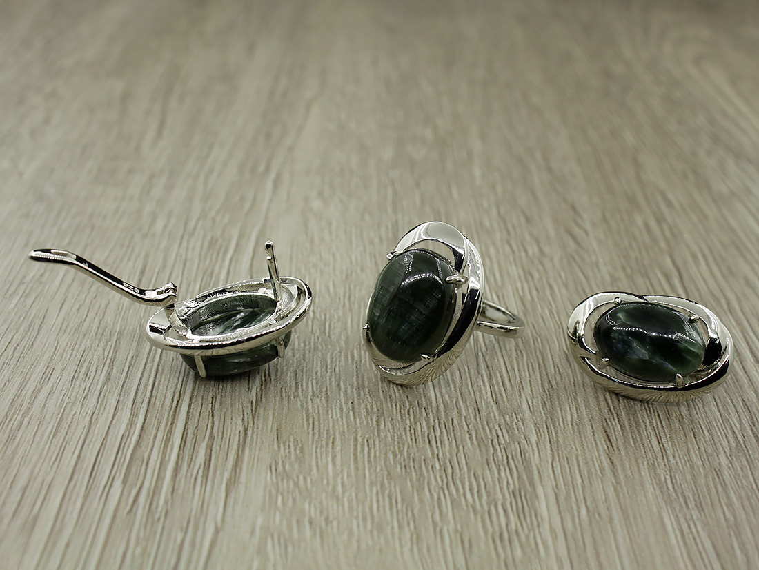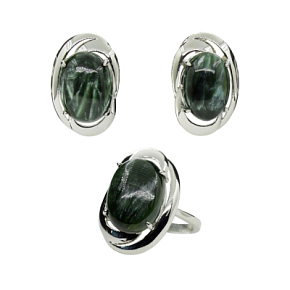 Элегантный комплект с натуральным серафинитом и качественным покрытием. Размер камня в серьге: 12x16мм, размер серьги с застежкой: 24мм. Размер камня в кольце: 12x16мм.